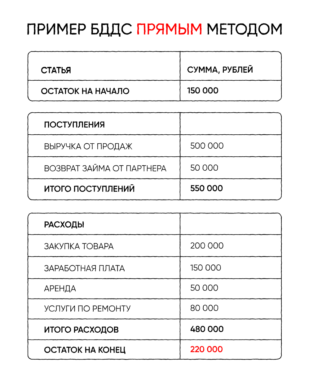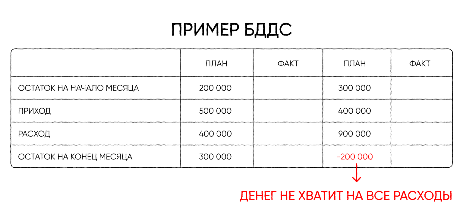 Бюджет движения денежных средств (БДДС) или cash flow — это финансовый план, в котором отражается вся информация о движении денег в компании: сколько денег есть в начале отчетного периода, какие поступления ожидаются, сколько планируется потратить и какой остаток будет на конец периода.