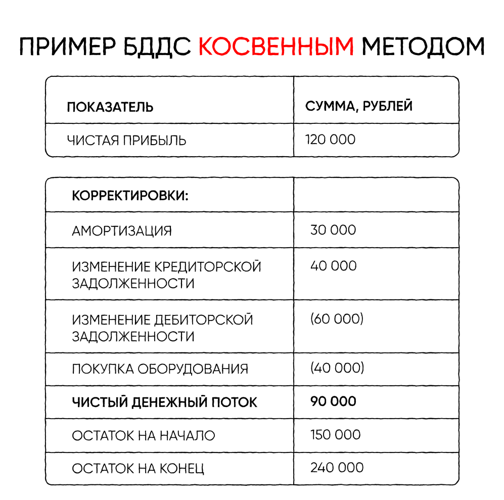 Косвенный метод начинается с расчета чистой прибыли за период. Затем этот показатель корректируют на неденежные операции: амортизацию и изменения в оборотных активах, обязательствах. Такой способ позволяет увязать финансовый результат с движением денежных средств, что облегчает анализ взаимосвязи между прибылью и ликвидностью.
