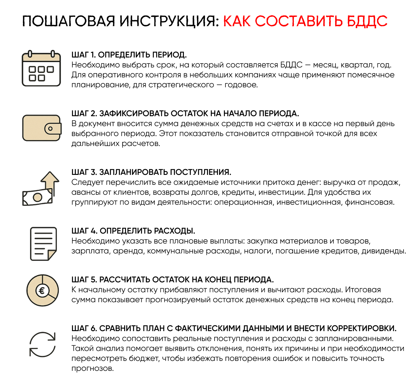 Шаг 1. Определить период. Необходимо выбрать срок, на который составляется БДДС — месяц, квартал, год. Для оперативного контроля в небольших компаниях чаще применяют помесячное планирование, для стратегического — годовое.