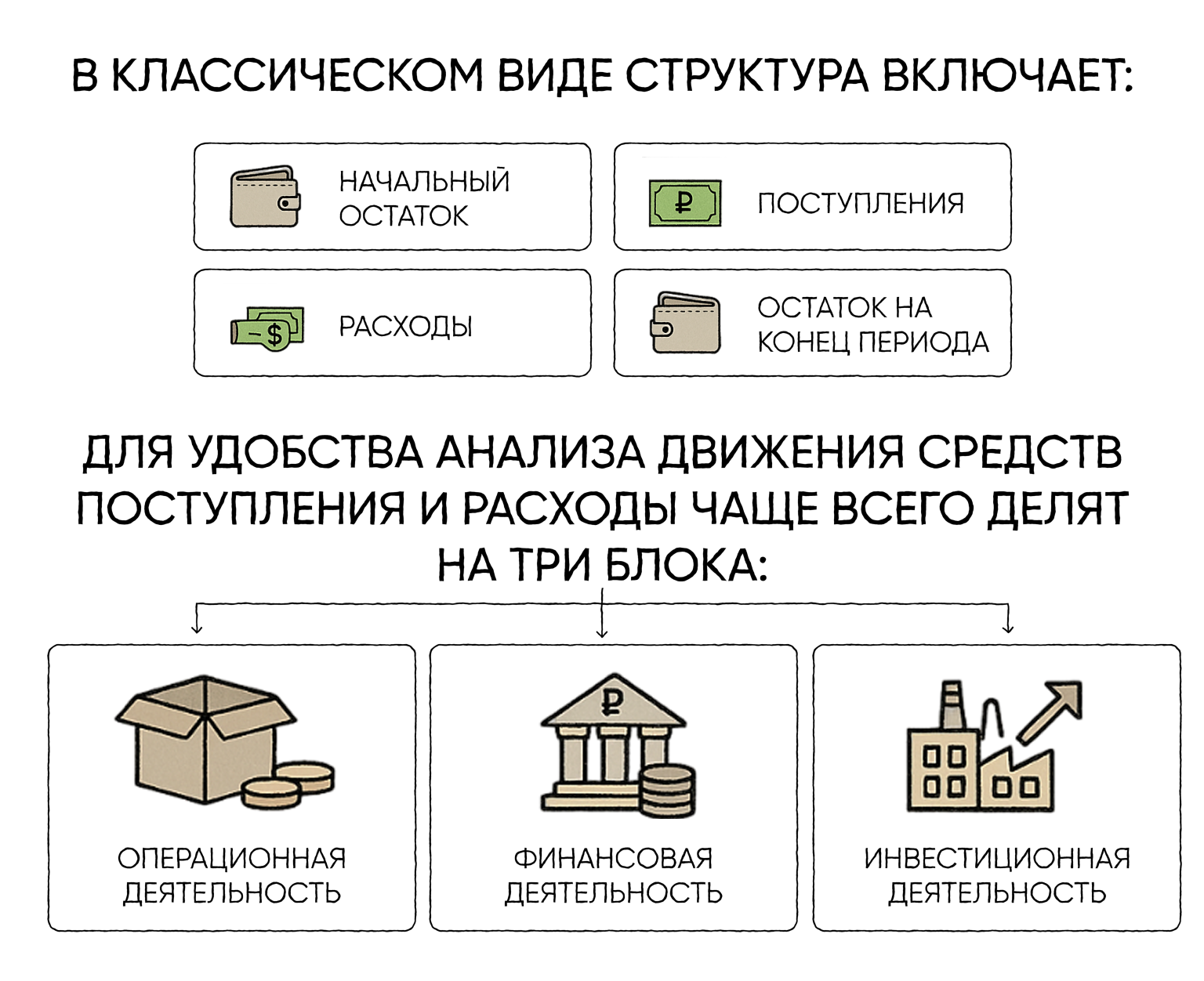 Для удобства анализа движения средств поступления и расходы чаще всего делят на три блока: