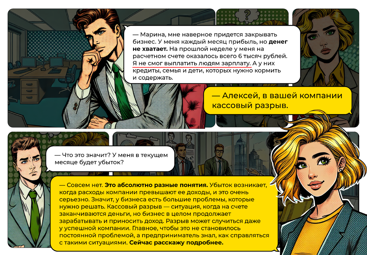 Объясняем понятнее: Большая часть доходов поступала в конце месяца, а наиболее крупные платежи — нужно было платить в середине. К этому времени денег уже не хватало и возникал кассовый разрыв.
