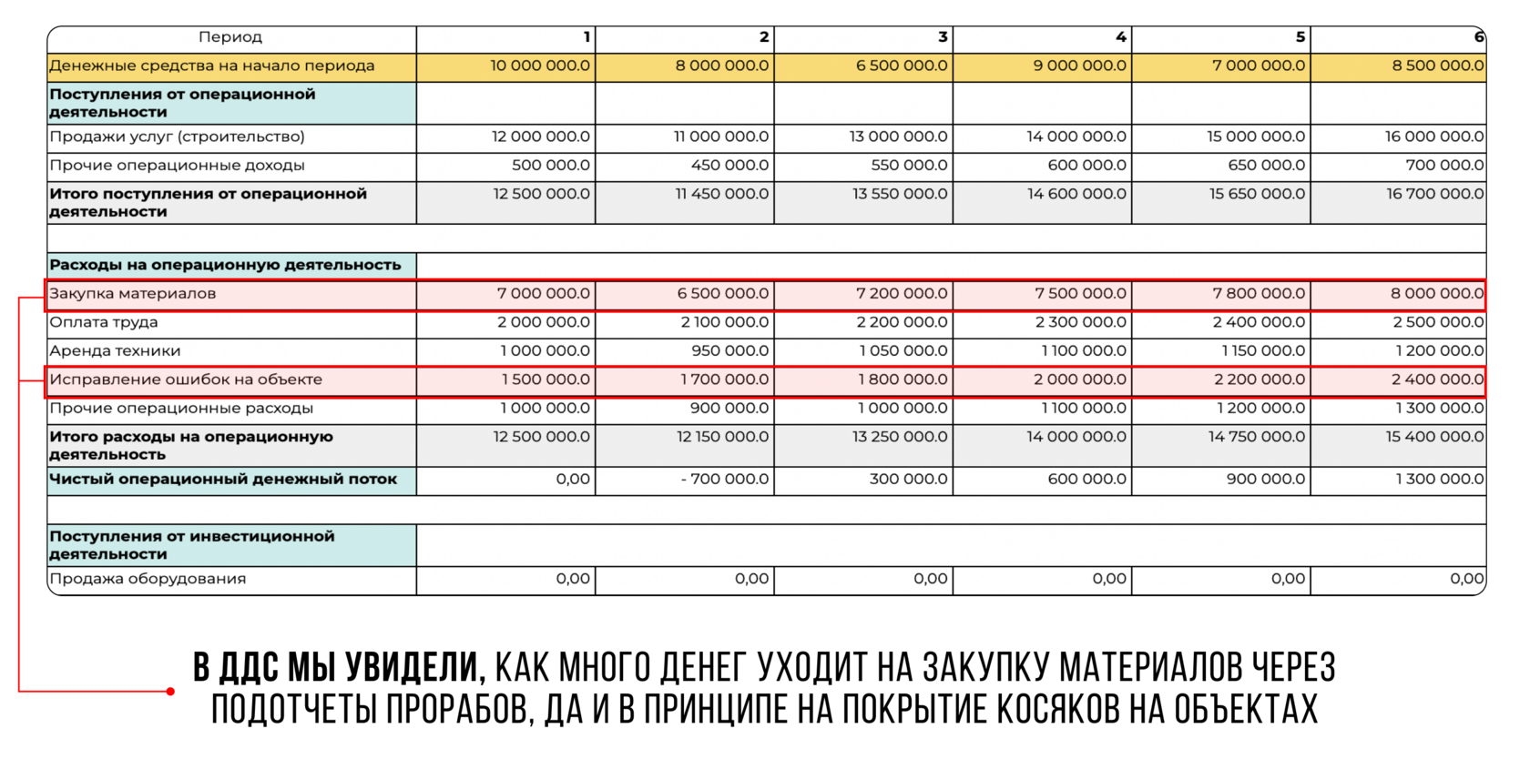 В ДДС мы увидели, как много денег уходит на закупку материалов через подотчеты прорабов, да и в принципе на покрытие косяков на объектах.