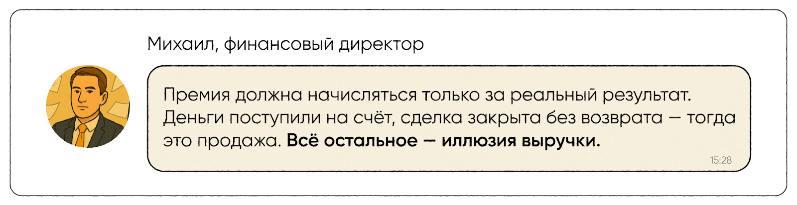 Михаил предложил пересмотреть систему: теперь премия начислялась только за закрытую продажу, когда деньги фактически поступили на счёт и сделка была завершена без возврата.
