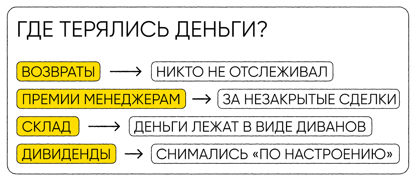 Каждый такой диван был фактически застывшими оборотными средствами — они числились как актив, но не приносили ни оборота, ни прибыли.