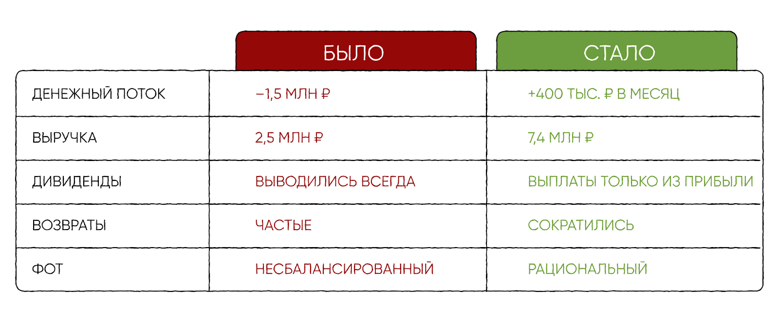 Собственник продолжил получать доход, но в рамках возможностей компании. Деньги перестали выводиться «на глазок», а в обороте всегда оставался необходимый резерв для стабильной работы и плановых платежей.